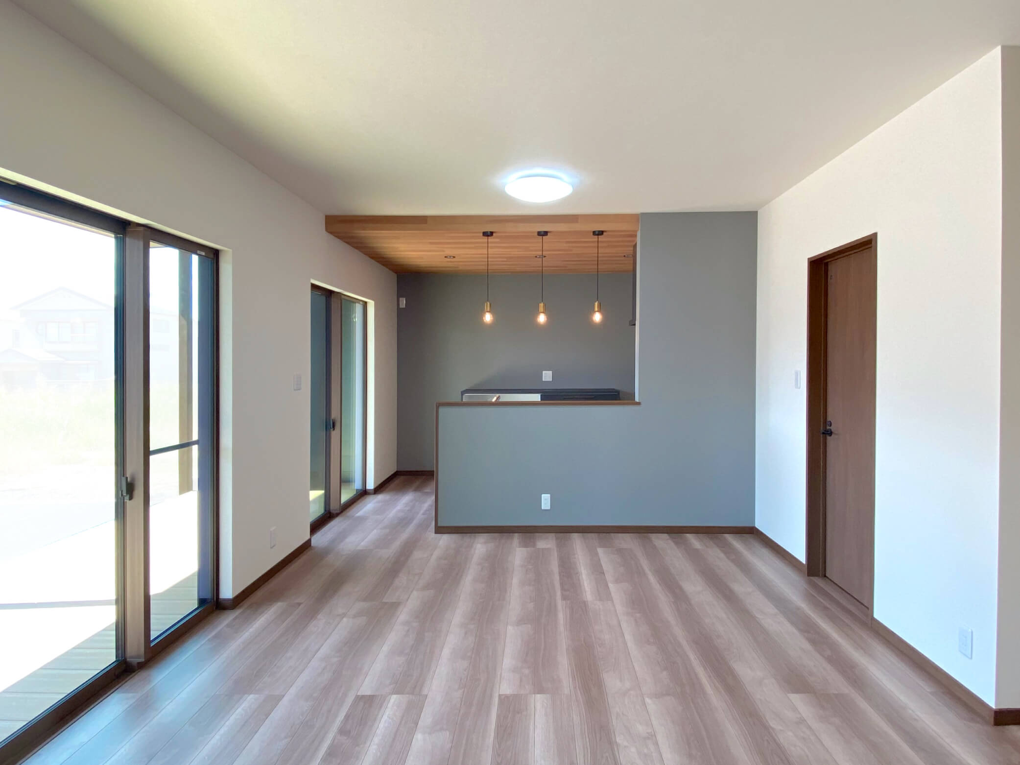 大きな窓の先に広がる約8帖のウッドデッキ。