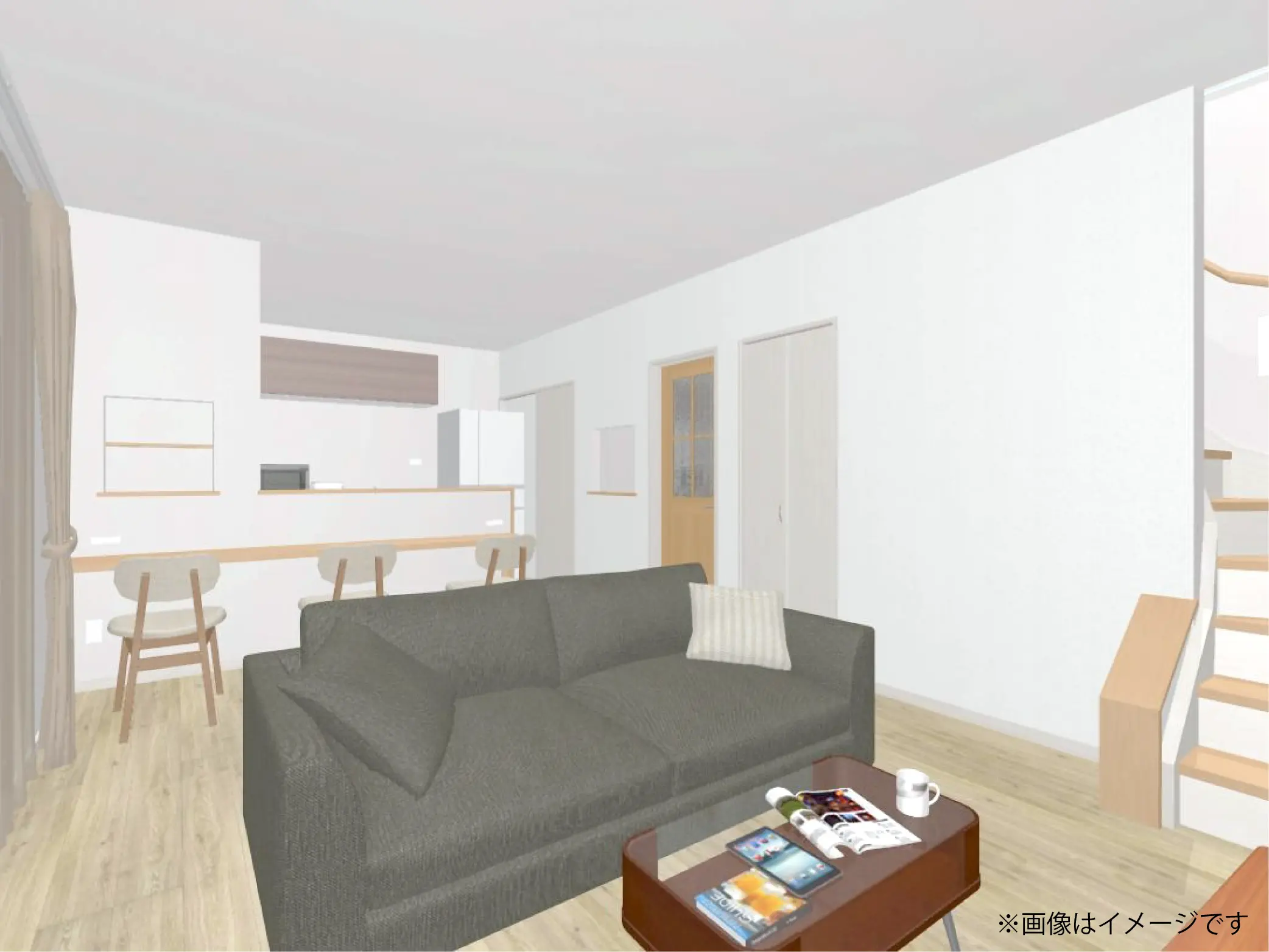 ダイニングテーブルは置かず、空間を有効に使うためリビングを優先した設計です。