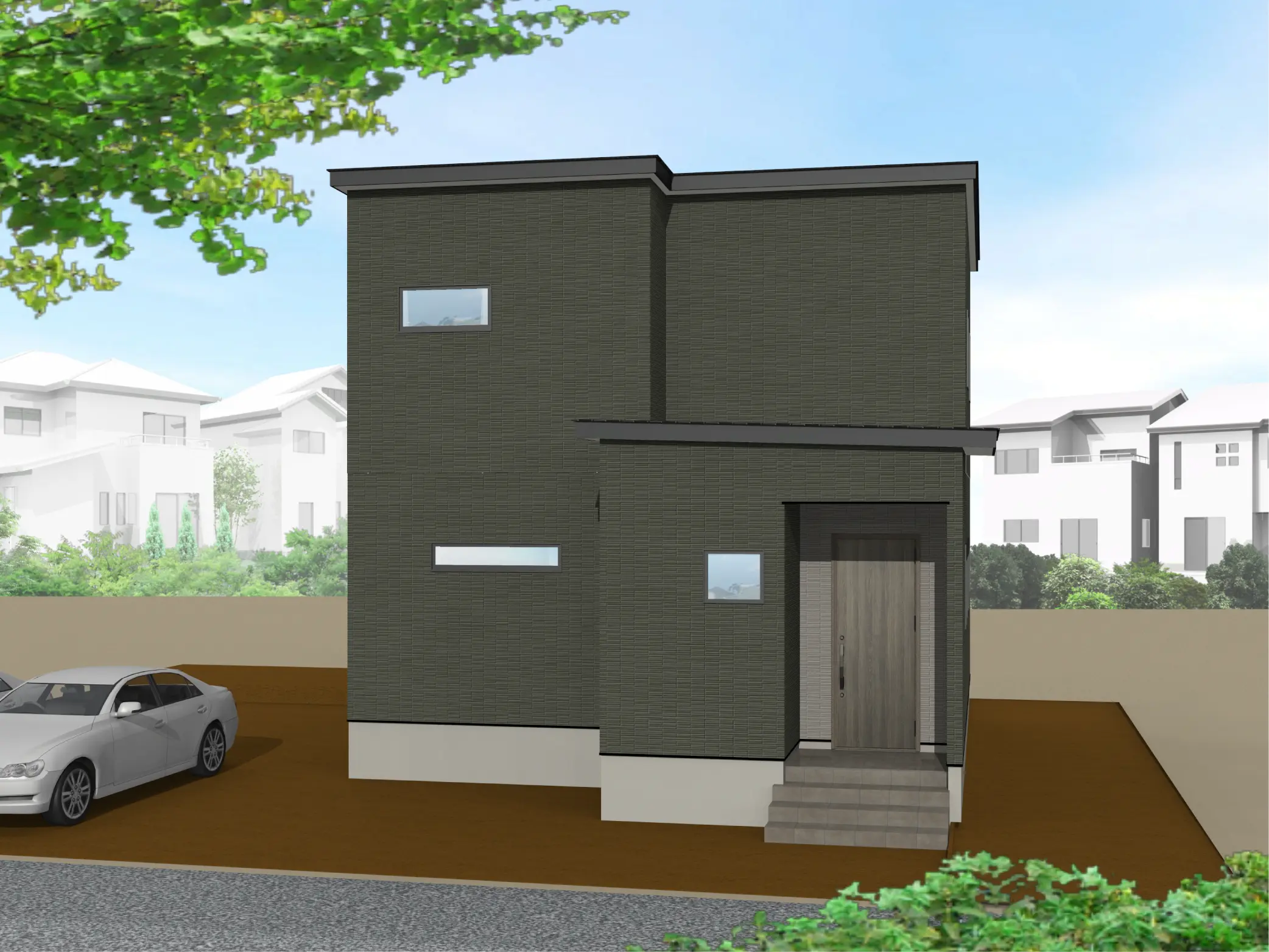 くすみがかったグリーン×グレーのモダンな外観。