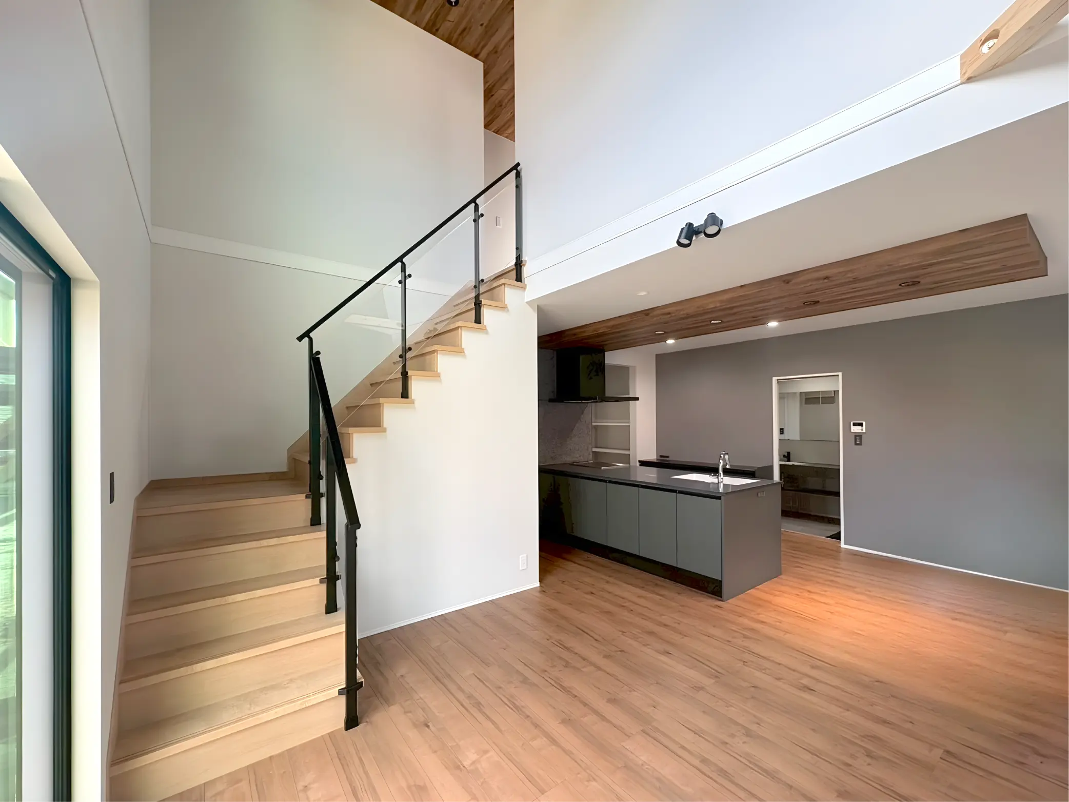 オープン階段と吹き抜けが、自然と視線を上へと導くLDK。