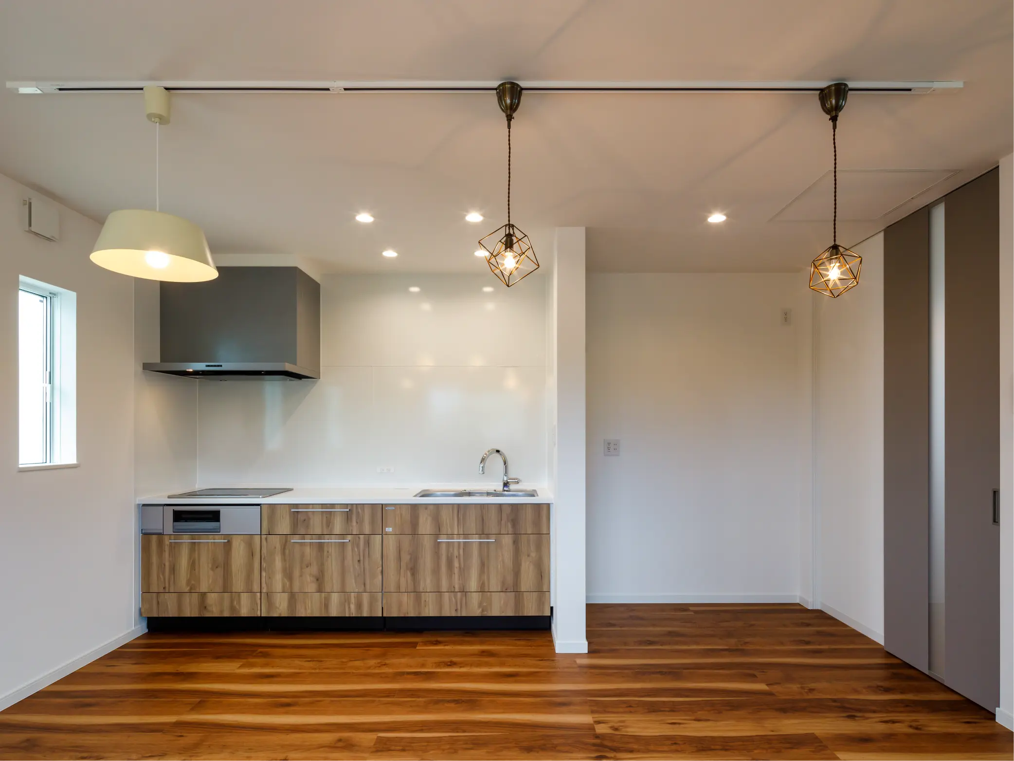 12.5帖のリビングは、天井まで高さのあるハイドアと、すっきりとした壁付けキッチンを採用。