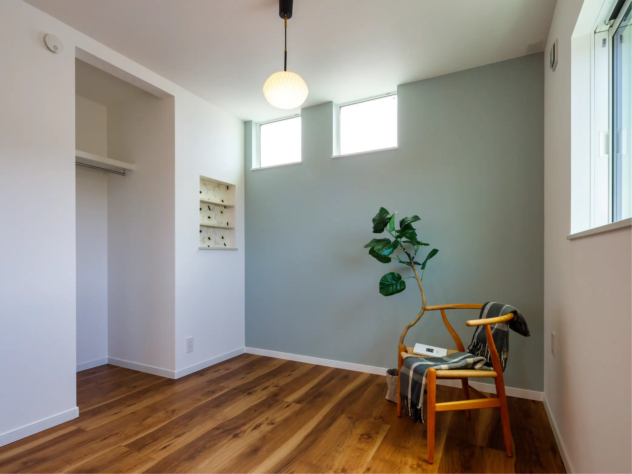 一面だけ取り入れたくすみグリーンのクロスが、リビングからの景色にさりげないアクセントを添えています。