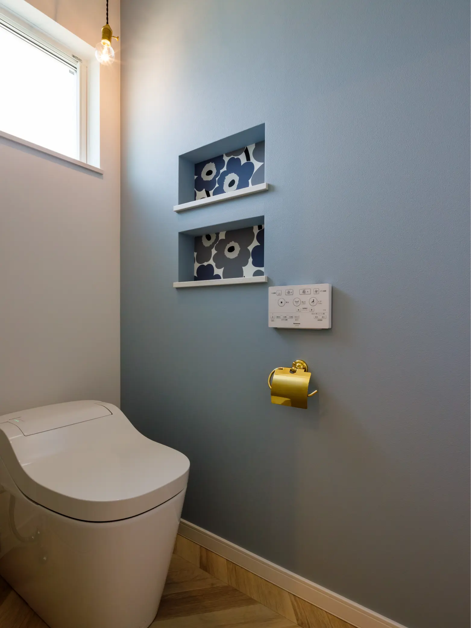 ニッチ部分には花柄のクロスをあしらい、ふと目に入る場所にも遊び心を。