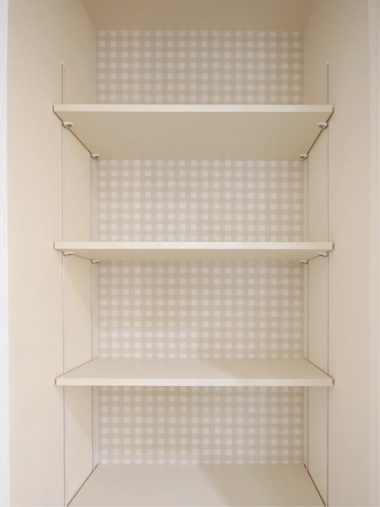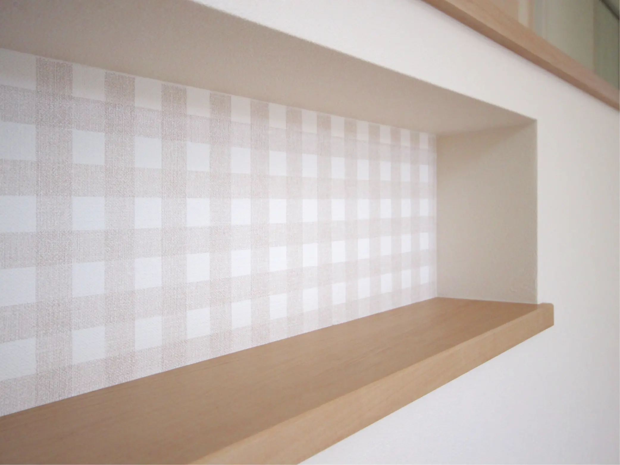 ピンクのチェック柄のアクセントクロスは、ニッチと収納の背面に。