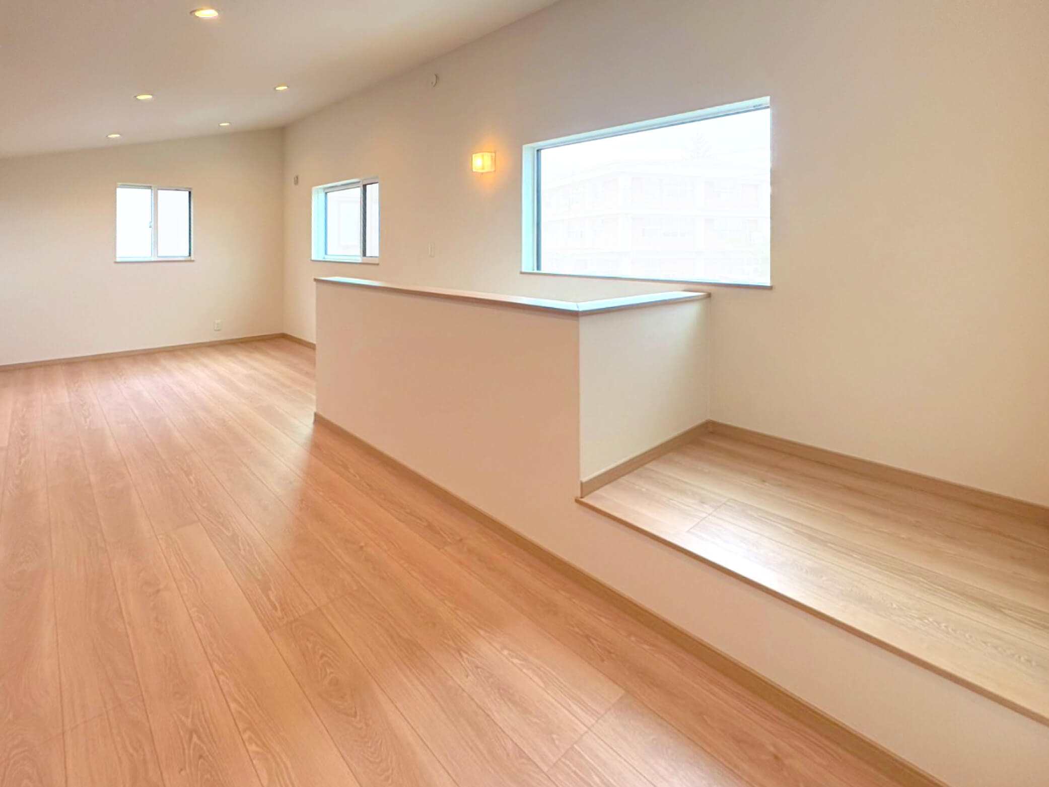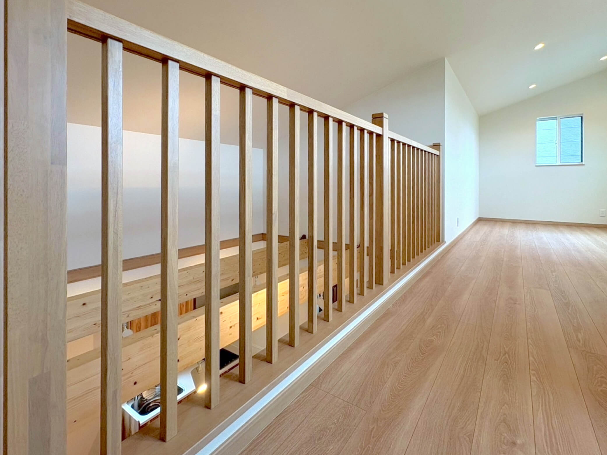 吹き抜けの上部には、光がたっぷり差し込む明るいホールと納戸を設計しました。