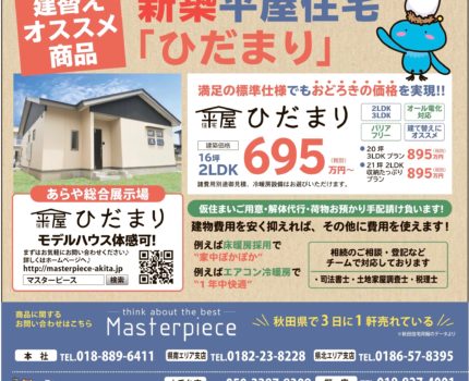 平屋ひだまりに建て替えられた、秋田市広面 K様邸のお引き渡しをいたしました! お喜びの声をいただき、とても嬉しく思います。 マスターピースではお引き渡しがゴールではありません。 3ヶ月後、6ヶ月後、1年後・・・20年後まで無料で点検・調査に伺います。 今後ともよろしくお願いいたします。……