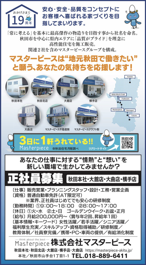 あなたの「秋田で働きたい!」を応援します。未経験でも安心の研修・教育制度。 最高 “傑作” の住まいづくりに携わりませんか?