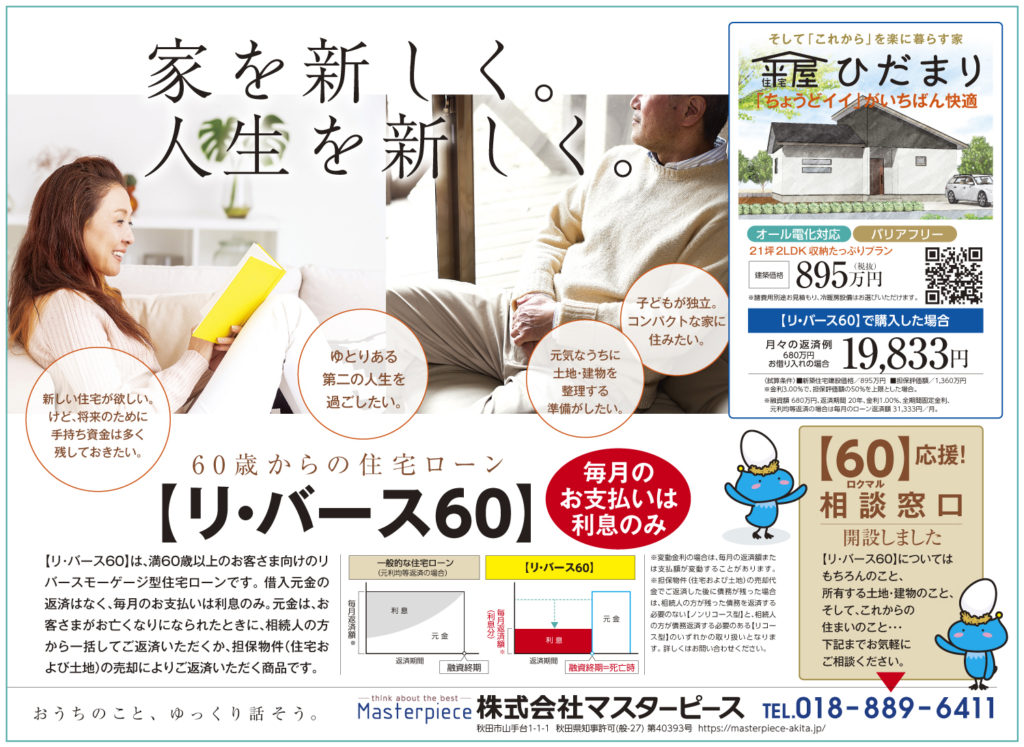 そんな方におすすめなのが、利息のみで家が建つ!借入元金返済なし60歳以上のお客様向け住宅ローン【リ・バース60】です。