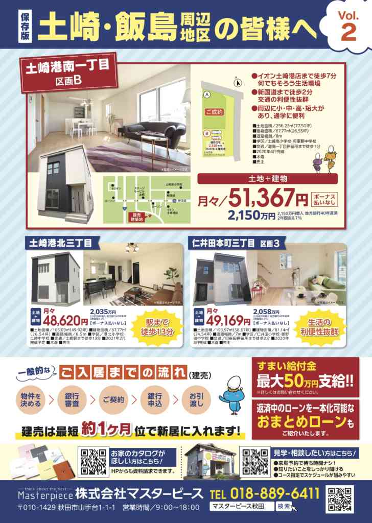 12/4発行 秋田市土崎・飯島周辺エリアのポスティングチラシにすぐ住める建売情報と家づくりの流れについて掲載しています。