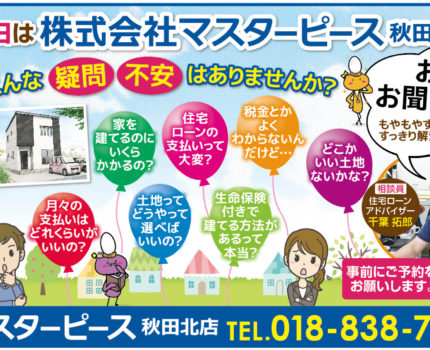 フリーペーパー等に折り込んでいる 秋田北店の広告です。 ただいま、はじめての家づくりフェアを開催中! 家づくりに関するどんな疑問も、丁寧に解決いたします。 現在、あらや総合展示場にて マスターピースの建物を実際に見ることができるので、 どんな家にし……