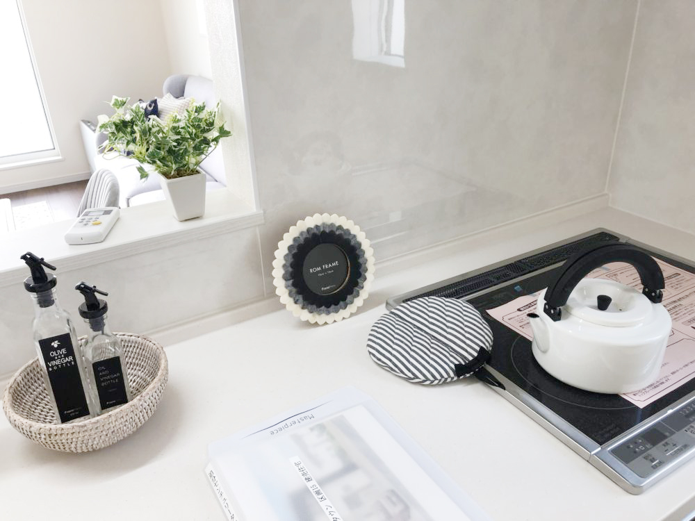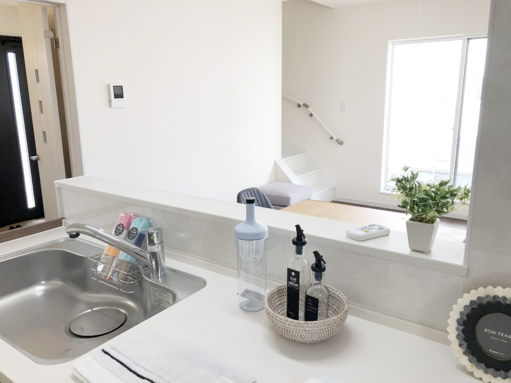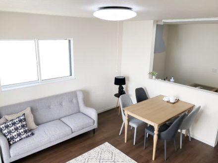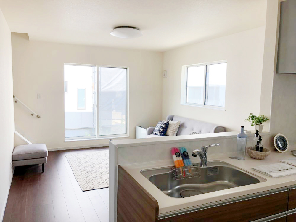 フレンチシックのインテリアコーディネートを施したセレクトType-A。多くの窓から降り注ぐ陽射しが心地良いです。対面キッチンなので料理をしながら室内を見渡すことができ、家族の会話が弾みます。