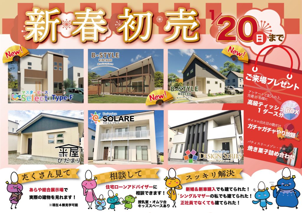 1/20(日)まで新春初売イベントを開催します♪ 豊富なプランのうち5つのプランを見学できる他に、新タイプのプランをご紹介!子育て世代に嬉しい間取りとスタイリッシュさを両立させた、マスターピースの新しいお家ができました。