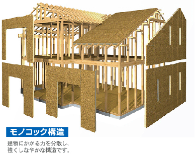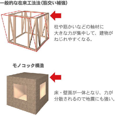 集成材+高強度金物+耐震パネルで構成するため、一般的な在来工法と比べ地震や台風、そして豪雪に強い構造に仕上がります。