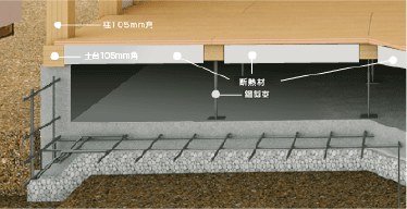 建物の重さを支えたり、家にかかる負荷を地盤に伝える基礎には、「鉄筋コンクリートオリジナルべた基礎」を採用。地震や台風時に家にかかる瞬間的な負荷を、効果的に地盤に分散して伝えます。鉄筋のかぶり厚さを大きくすることで鉄筋の腐食を防ぎ、高い耐久性を保持します。
