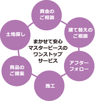 マスターピースでは、家に関するあらゆる場面でお客様のサポートを徹底しています。資金のご相談から土地探し、商品のご提案、施工、アフターフォロー、そしてライフスタイルの変化に合わせた建て替えのご相談まで承ります。