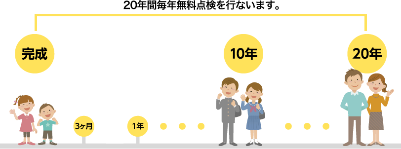 マスターピースは完成引き渡しがゴールではありません。お引き渡ししたその日から、アフターフォローは始まります。3ヶ月後、1年、2年…そして20年後まで、当社から連絡を差し上げてお客様のご都合に合わせた日時で、無料で点検・調査に伺い、暮らしを見守ります。