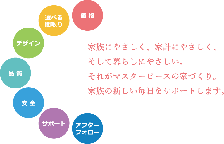 マスターピースでは、家を建てようとしている方、家を建築中の方、そして夢のマイホームに住み始めた方など、マスターピースと関わったすべてのお客様に楽しく安心できる家づくりや暮らしをしていただくため、あらゆる面で「お客様目線」を持ち続けます。